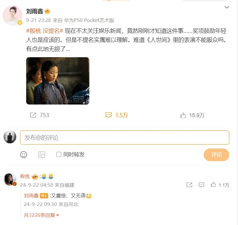 演员刘雨鑫发微博直接声援殷桃,获得了近16万的点赞和殷桃留言,随即登上了微博热搜。