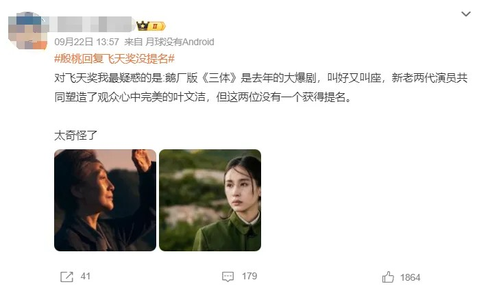 除了替殷桃打抱不平,也有人为《三体》的老和青两版的叶文洁扮演者陈瑾和王子文发声,觉得两人总该有一位可以得到提名。