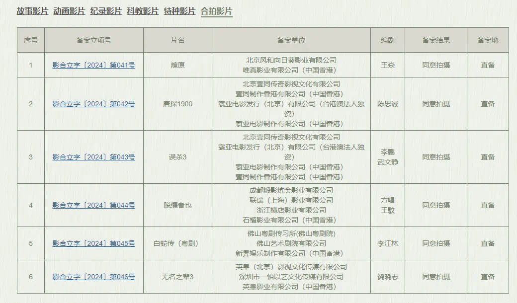 12月13日,国家电影局发布新一轮电影备案公示信息。