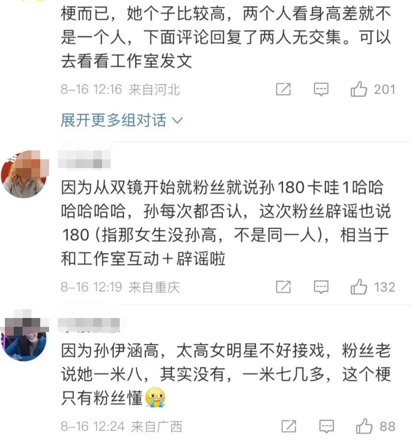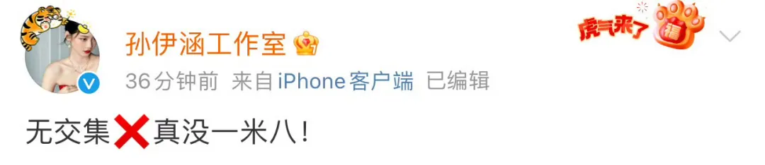孙伊涵也躺枪,对此孙伊涵工作室发文:“无交集,真没一米八!”,否认图中女生是孙伊涵。