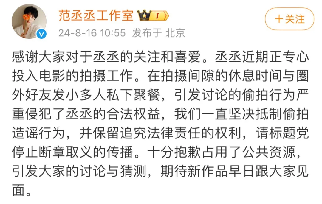 范丞丞工作室也发文回应:在拍摄间隙的休息时间与圈外好友发小多人私下聚餐,坚决抵制偷拍。