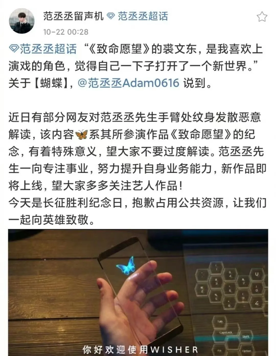 当时,范丞丞工作室辟谣恋情,说蝴蝶是为了纪念角色。