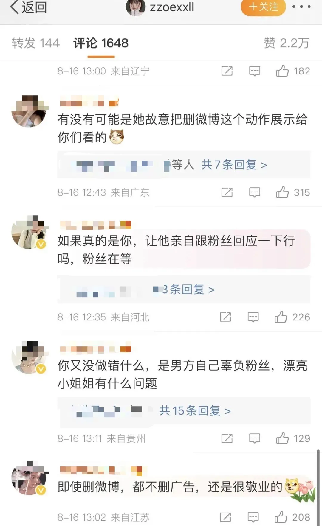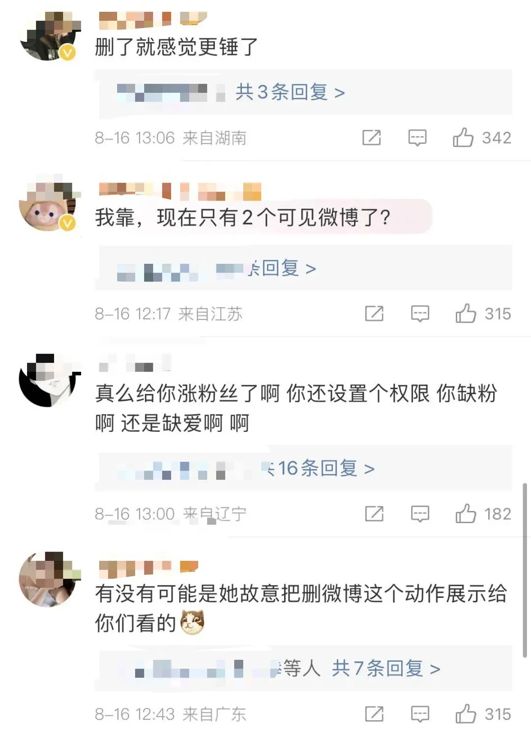 目前,许多网友涌入zzoexxll的账号,她隐藏了两百多条微博,只剩下两条微博网友可见。评论区不少网友觉得:“删了就感觉更锤了”。