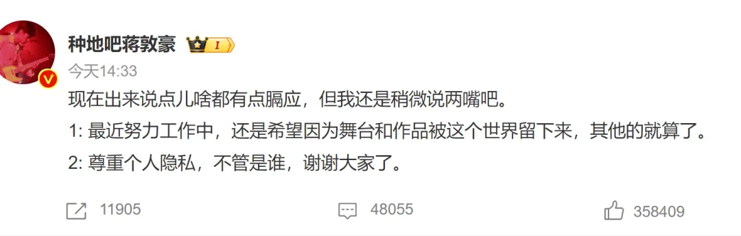今天下午,蒋敦豪发博回应了恋情,表示:“尊重个人隐私,不管是谁。”