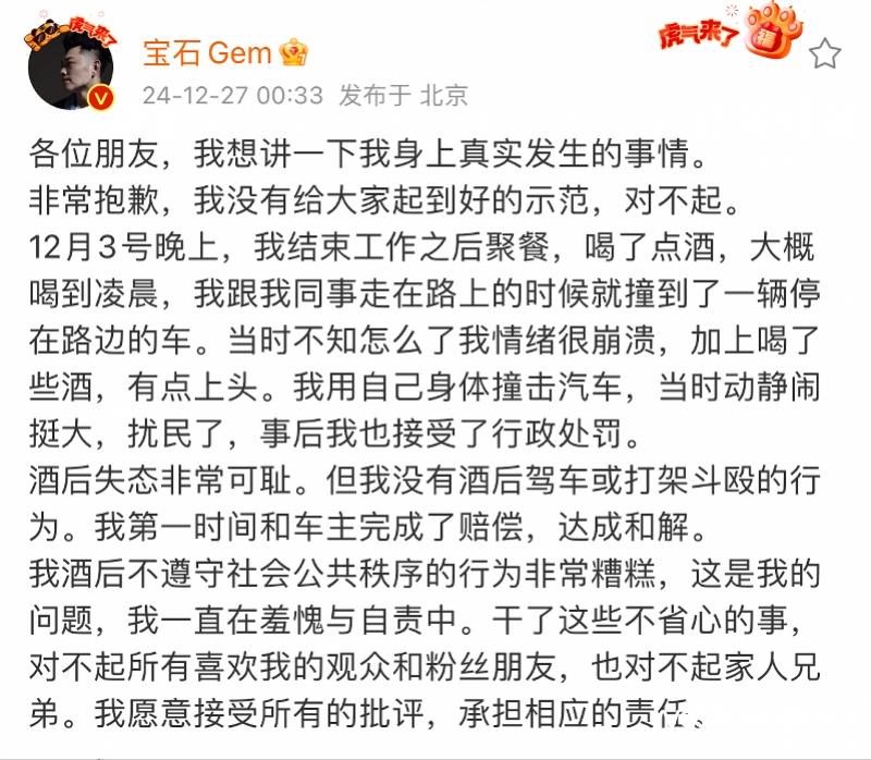 宝石Gem在文中表示,事情发生在12月3日晚,他结束工作后聚餐至凌晨,跟同事走在路上时撞到了一辆停在路边的车。“当时不知怎么了我情绪很崩溃,加上喝了些酒,有点上头。我用自己身体撞击汽车,当时动静闹挺大,扰民了,事后我也接受了行政处罚。”