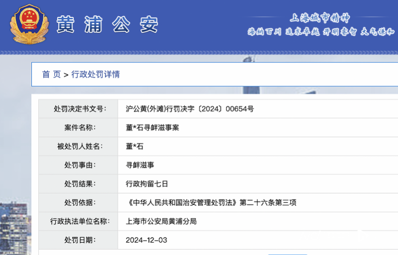 27日凌晨,在宝石Gem发文正式作出回应之后,南都记者在上海市公安局黄浦分局官方网站查询到12月3日的一则行政处罚公告,被处罚人姓名为董*石,处罚事由为寻衅滋事,处罚结果为行政拘留七日,疑似对应该事件。
