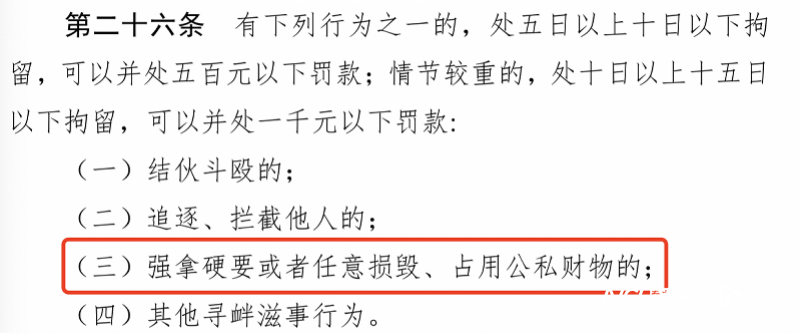 根据公告显示的处罚依据,《中华人民共和国治安管理处罚法》第二十六条第三项的对应内容为“强拿硬要或者任意损毁、占用公私财物的”。