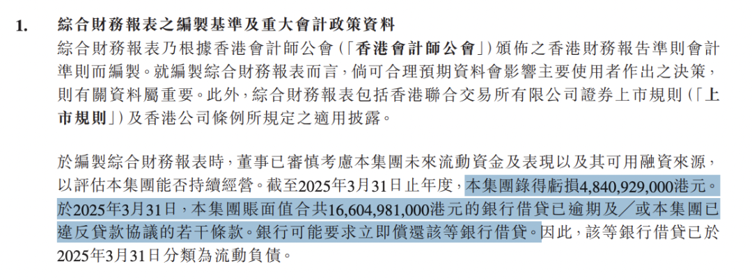 财报提到,166亿港元银行借款已出现逾期或违约情况,银行可能要求立即偿还全部款项。