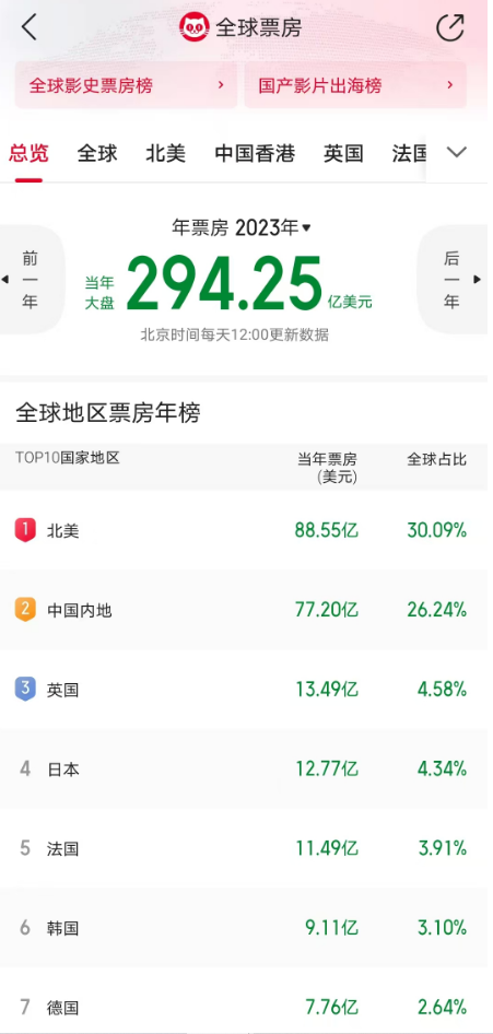 放眼海外,全球电影市场在上半年也遇到了不少困难。2023年全球电影市场总票房为294亿美元。其中北美市场占据了89亿美元,紧随其后是中国内地市场77亿美元,全球电影第三大市场英国全年票房只有13亿美元。