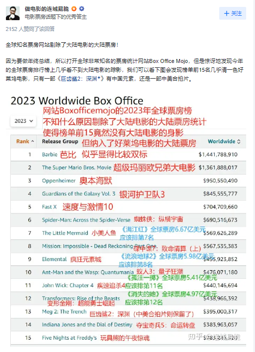 本片是唯一一部位列全球前十的国产电影。