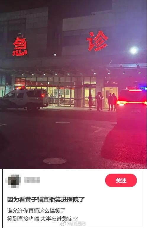 当时,有网友发布了一张医院急诊的照片,并配文:因为看黄子韬直播大半夜进了急诊。据网友称,自己是因为大笑引发哮喘,才去医院就诊的。目前网友已经离开医院,身体无大碍。