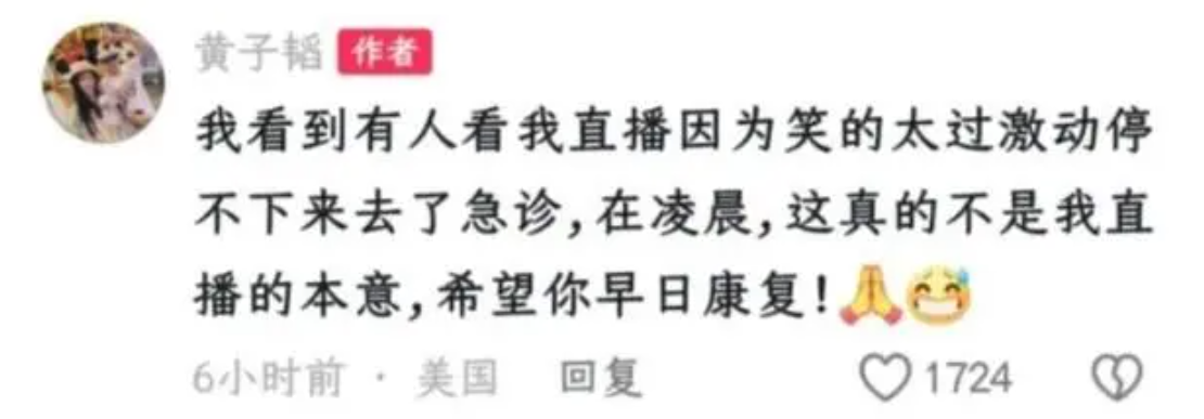 对此,黄子韬本人回复:我看到有人看我直播因为笑得太过激动停不下来去了急诊。这真的不是我直播的本意,希望你早日康复。