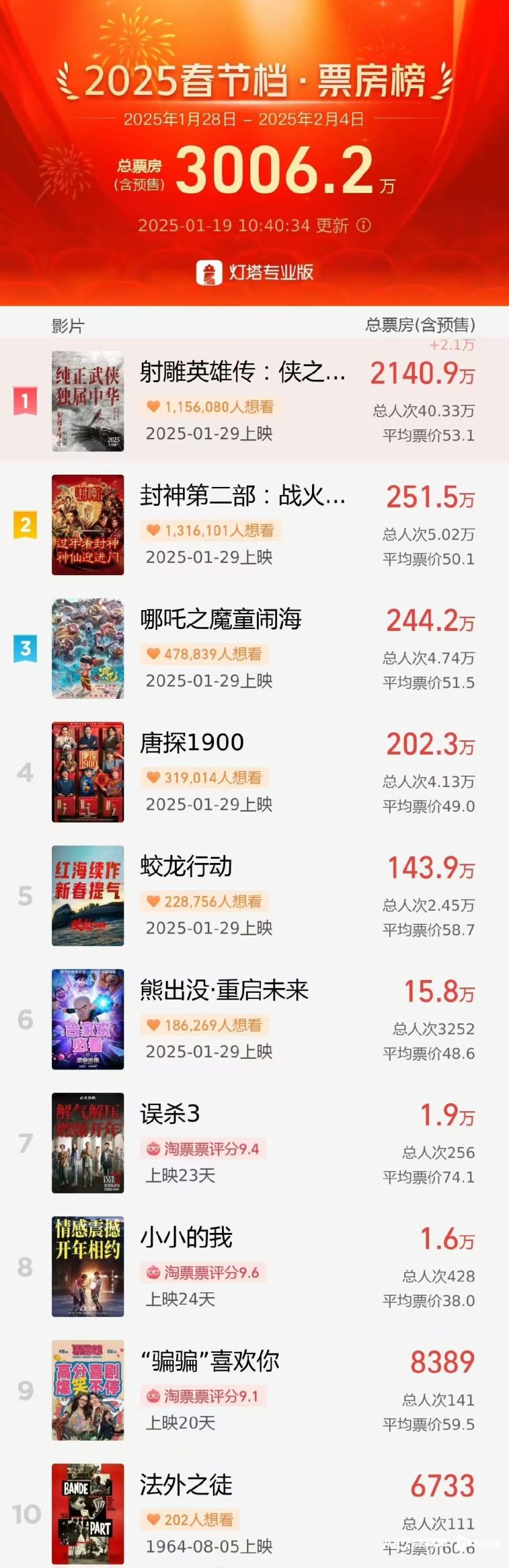 南都讯 记者林经武 1月19日,2025春节档开启预售。据灯塔专业版数据显示,仅用时1小时40分钟,2025春节档档期预售总票房突破3000万元,刷新中国影史预售最快破3000万元纪录。