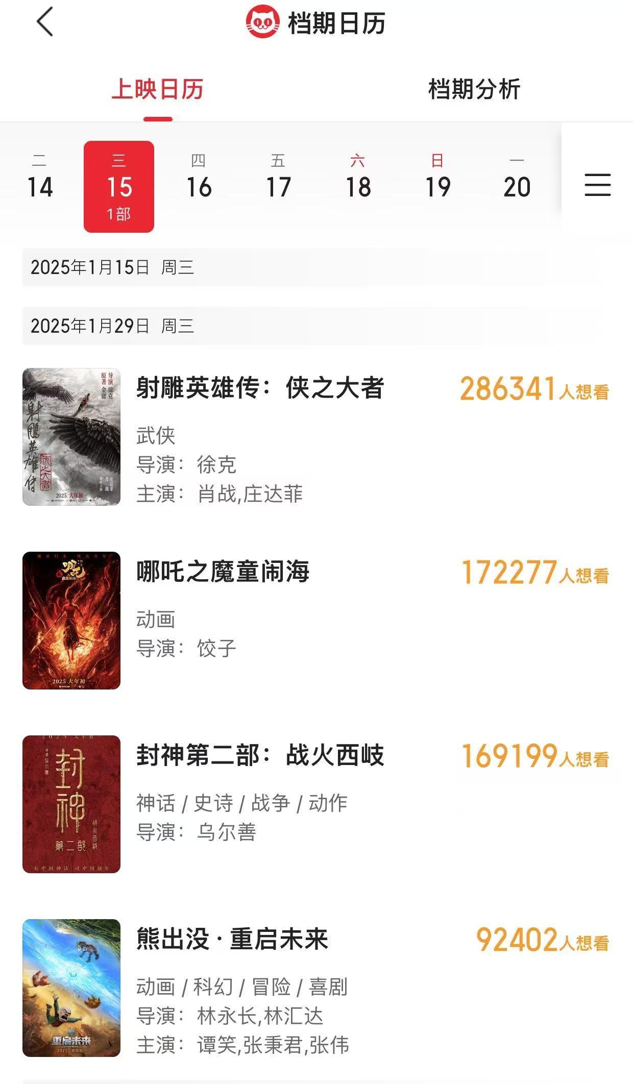 据猫眼专业版显示,截至当前共有4部影片定档2025年春节档上映,分别为《哪吒之魔童闹海》《射雕英雄传:侠之大者》《封神第二部:战火西岐》《熊出没·重启未来》。