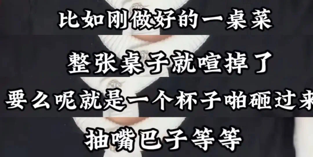 一是她要和朋友去喝咖啡,这个男的就会很愤怒,争吵时对她动手,比如刚做好一桌菜,掀翻、扔杯子、抽嘴巴子等等。