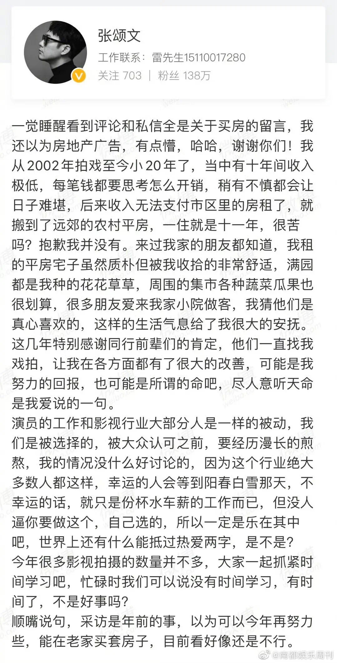 张颂文发长文向关心他买房一事的网友们致谢,并分享了自己近20年演员生涯的生活处境:“当中有十年间收入极低,稍有不慎都会让日子难堪,后来收入无法支付市区里的房租了,就搬到了远郊的农村平房,一住就是十一年。”但他不觉得苦,很享受自己的小院,目前生活也有很大改善,但“在老家买套房子,目前看好像还是不行。”