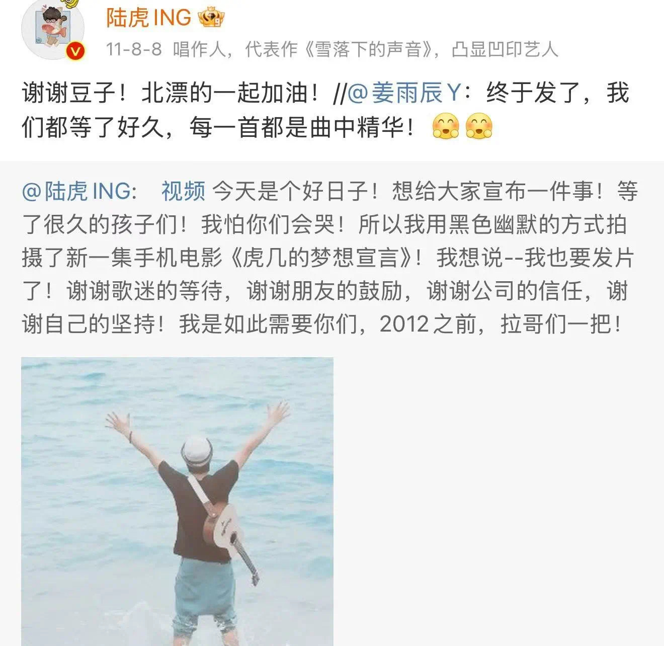 而多年前,姜尘名字还叫姜雨辰的时候,2011年发博说自己不能演戏,得找张颂文老师好好重新建设一下。