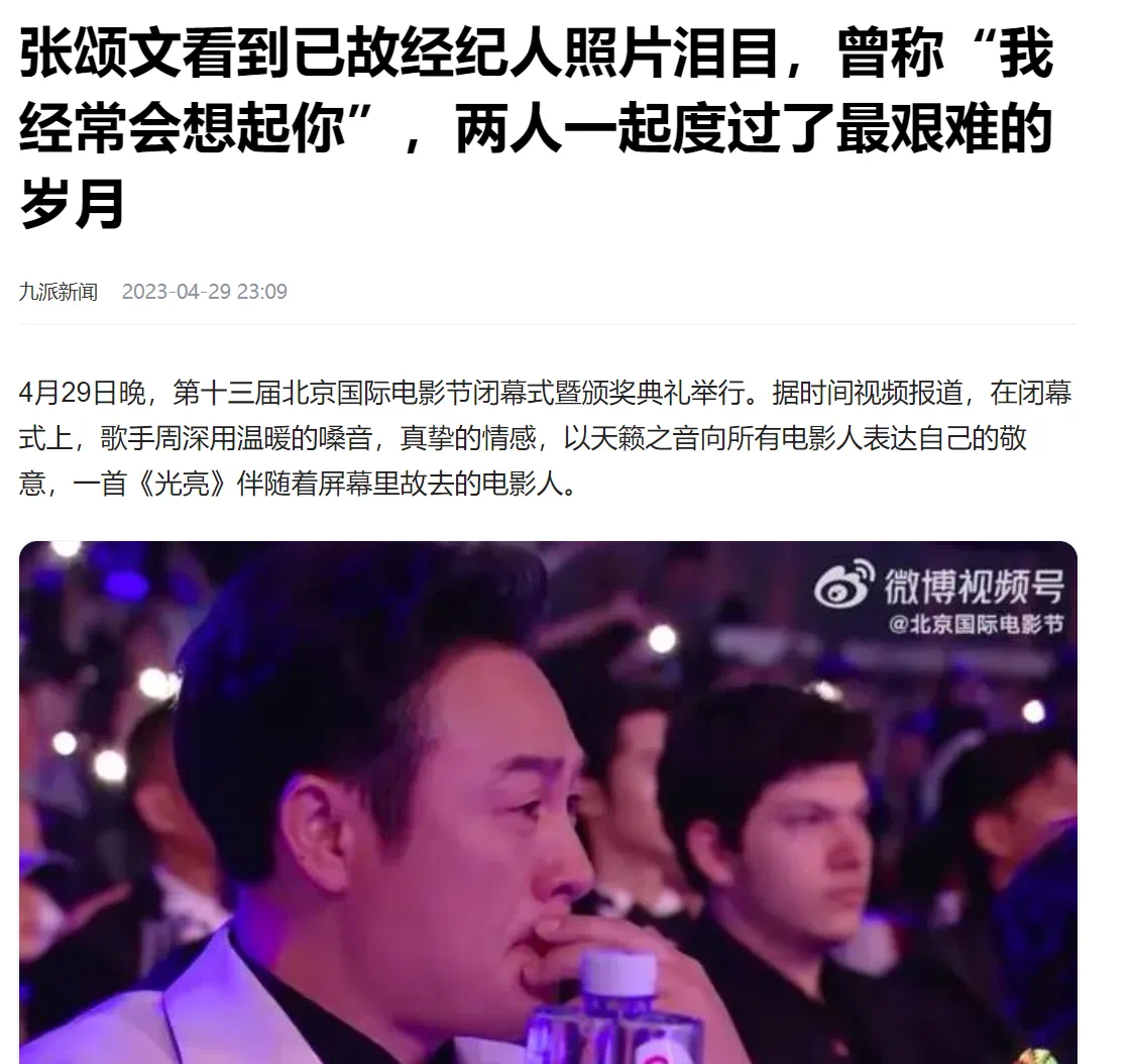 2023年,张颂文在北京国际电影节闭幕式看到自己已故经纪人赵玉德的照片,忍不住哭了。