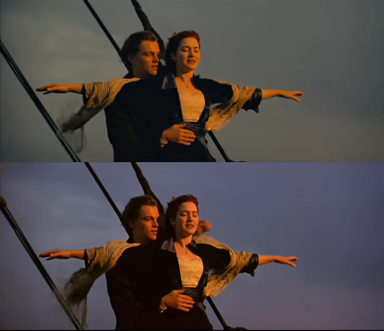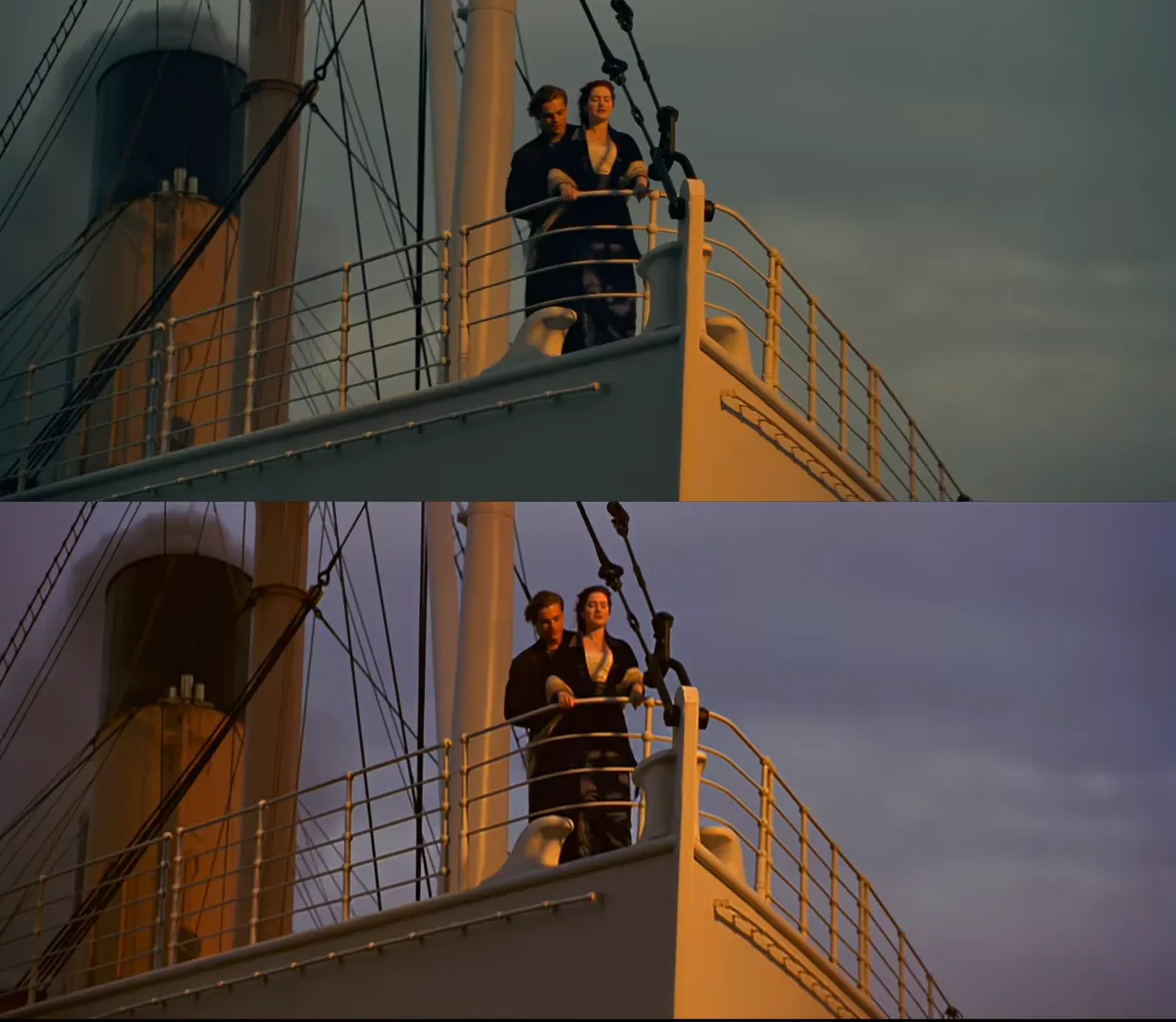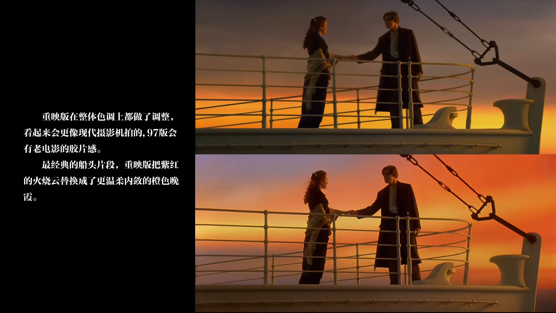 从视觉呈现上,修复版把天空色彩修得更克制,变灰变暗了。也许修复版在专业人士看来,这样的色彩才是对的,但也有部分观众还是喜欢1997年绮丽旖旎、略带梦幻的落日余晖。