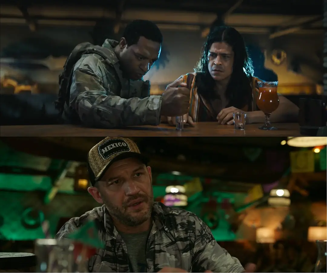 在前一部作品中,埃迪作为被寄生者,更多地处于无奈之下被动接受操控的位置,而在第二部中,埃迪本身已逐渐主动施展能力,直至本作中,埃迪更开始以自己的身体施展暴力手段,他的内心很明显受到了毒液的影响,逐渐暴躁,这或许也是他“宿醉”的原因。