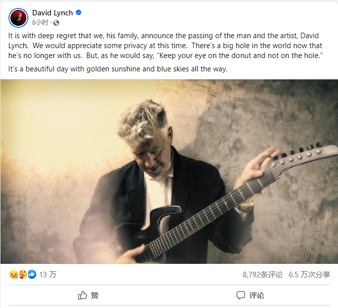 “我们深感遗憾地宣布艺术家大卫·林奇的逝世,期盼也感谢外界能给我们一些隐私。他的离开,让这世上彷彿破了一个大洞。但正如他所说‘眼睛要看着甜甜圈,别盯着上头的洞’,今天仍是美好的一天——有灿烂阳光和湛蓝天空”。