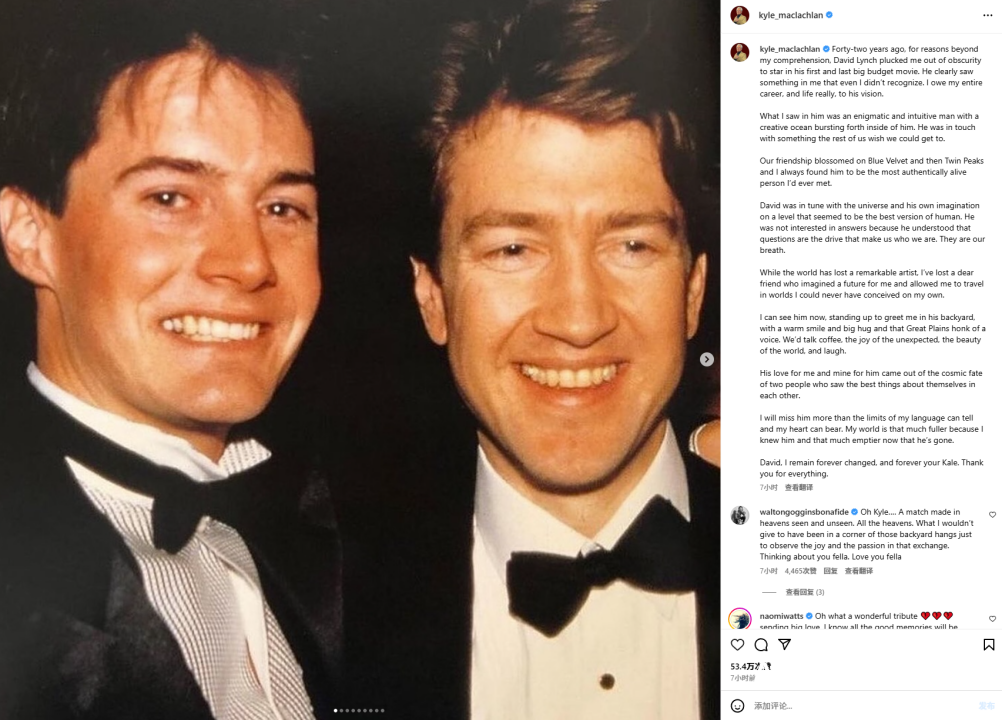 大卫·林奇去世后,出演过《蓝丝绒》《双峰》的凯尔·麦克拉克伦在社交媒体悼念道:“我的整个职业生涯乃至生命,都要归功于他的远见。”