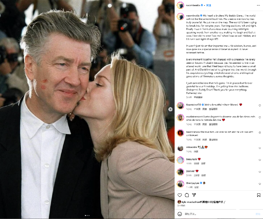 出演过《穆赫兰道》《内陆帝国》的娜奥米·沃茨在社交媒体写道:“我真不敢相信他已经走了,我心很痛,我永远感谢我们的友谊。”