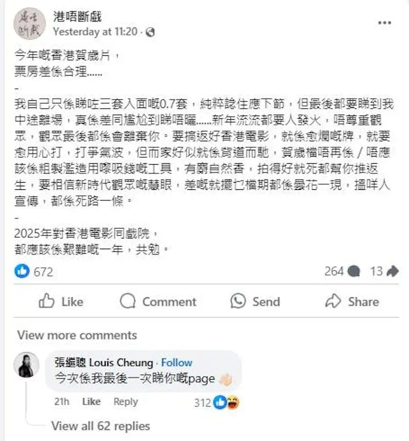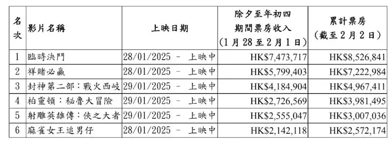 哪怕内地春节档新片《射雕英雄传:侠之大者》和《封神第二部:战火西岐》和》也有在香港上映,但票房表现同样不佳,均未能突破千万。香港戏院商会表示,今年香港的春节档成绩令人失望。