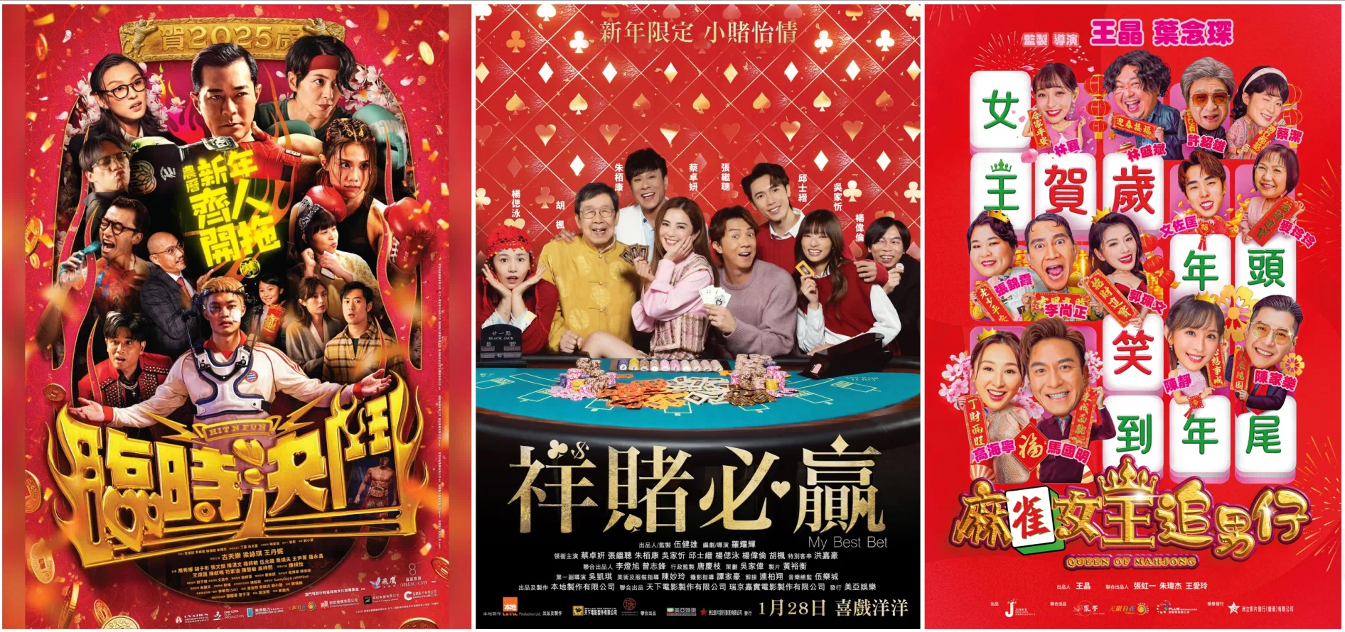 根据香港电影网站WMOOV的数据,今年香港有三部本土制作的春节新片上映,全部都是喜剧,分别是古天乐和梁咏琪主演的《临时决斗》、阿Sa(蔡卓妍)和张继聪主演《祥赌必赢》、王晶和叶念琛导演的《麻雀女王追男仔》。看题材和海报风格,仿佛回到了《呖咕呖咕新年财》的年代。