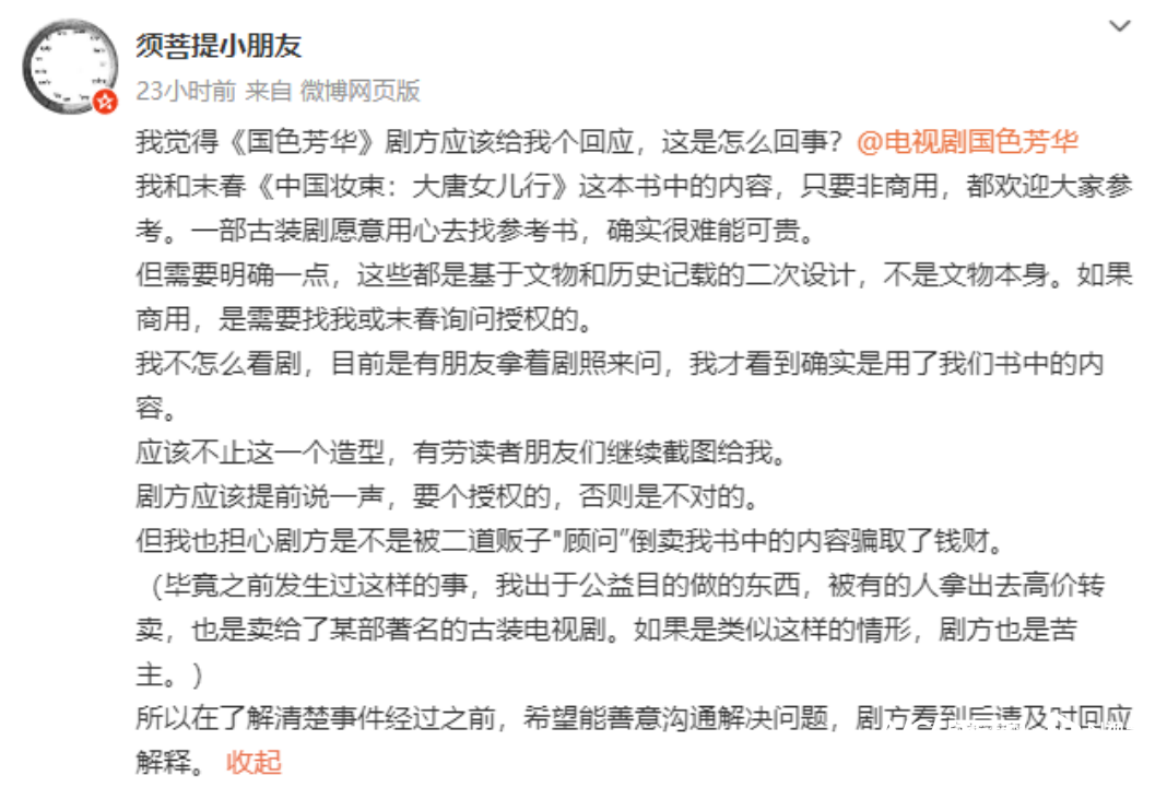 1月12日下午,《中国妆束·大唐女儿行》作者左丘萌(@须菩提小朋友)发文表示其作品的内容在未经授权的情况下被《国色芳华》剧组使用,希望剧方能够及时回应解释。