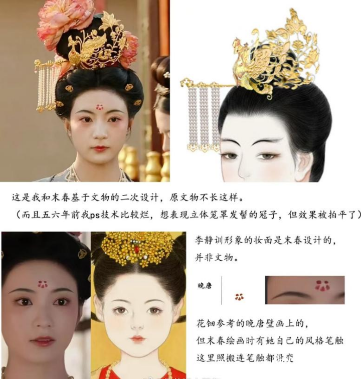 同时,左丘萌还配上了《国色芳华》剧照与其所著的《中国妆束·大唐女儿行》中呈现的妆容图片的对比图。