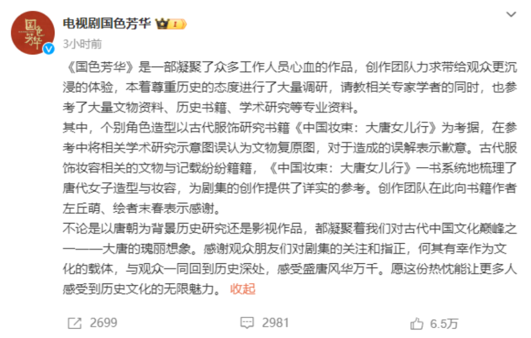 剧方表示,《国色芳华》创作团队在角色造型设计中参考了大量专业资料,过程中将《中国妆束·大唐女儿行》中学术研究示意图误认为文物修复图,从而造成误解,并向书籍作者左丘萌、绘者末春表示感谢。