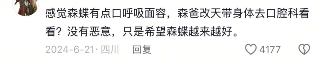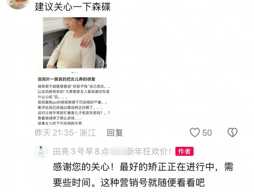 这两天,有网友指出森碟下巴后缩,还给田亮留言“建议关心一下森碟”。对此,田亮回复:“感谢您的关心!最好的矫正正在进行中,需要些时间。这种营销号就随便看看吧!”