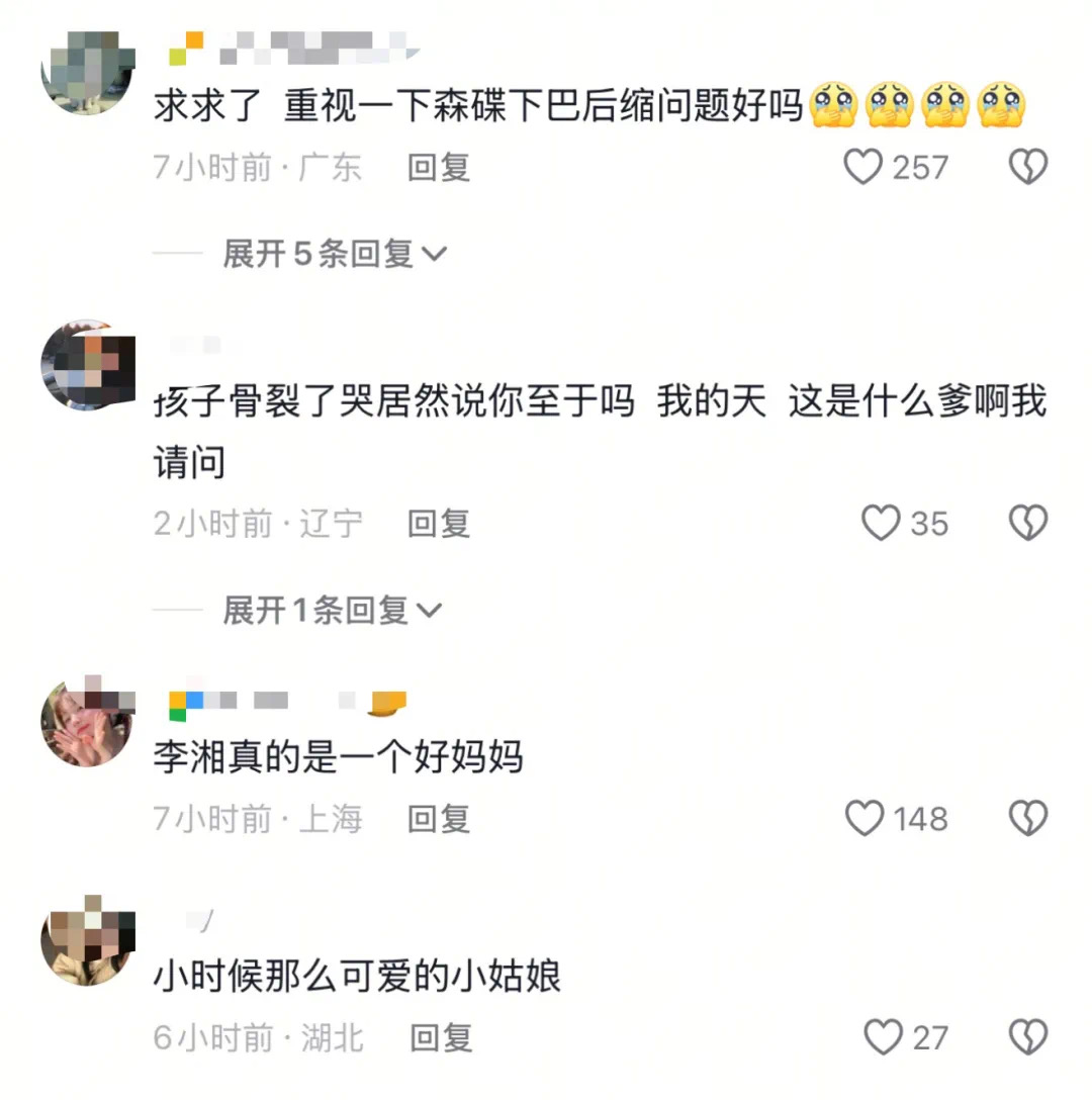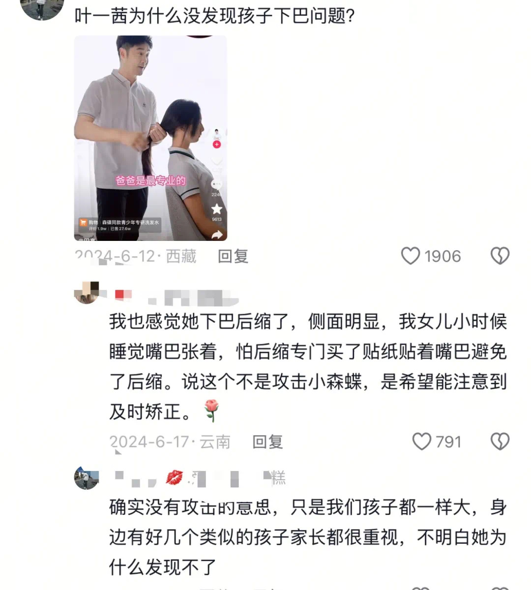 从田亮叶一茜各个社交账号的评论区看到,大批网友提醒夫妻俩要注意女儿下巴后缩的问题。