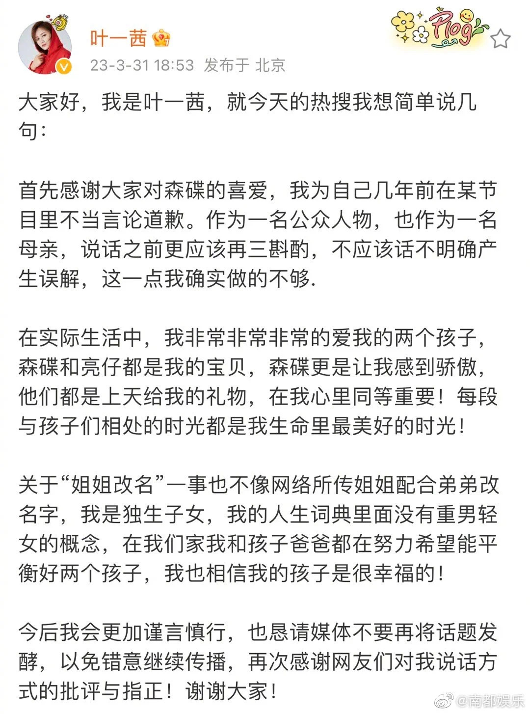 2023年,叶一茜发长文回应网上争议,为自己几年前在节目里的不当言论道歉,同时表明自己并没有重男轻女,“在实际生活中,我非常非常非常的爱我的两个孩子,森碟和亮仔都是我的宝贝,森碟更是让我感到骄傲,他们都是上天给我的礼物,在我心里同等重要!”“关于“姐姐改名”一事也不像网络所传姐姐配合弟弟改名字,我是独生子女,我的人生词典里面没有重男轻女的概念”,称自己以后会更加谨言慎行。