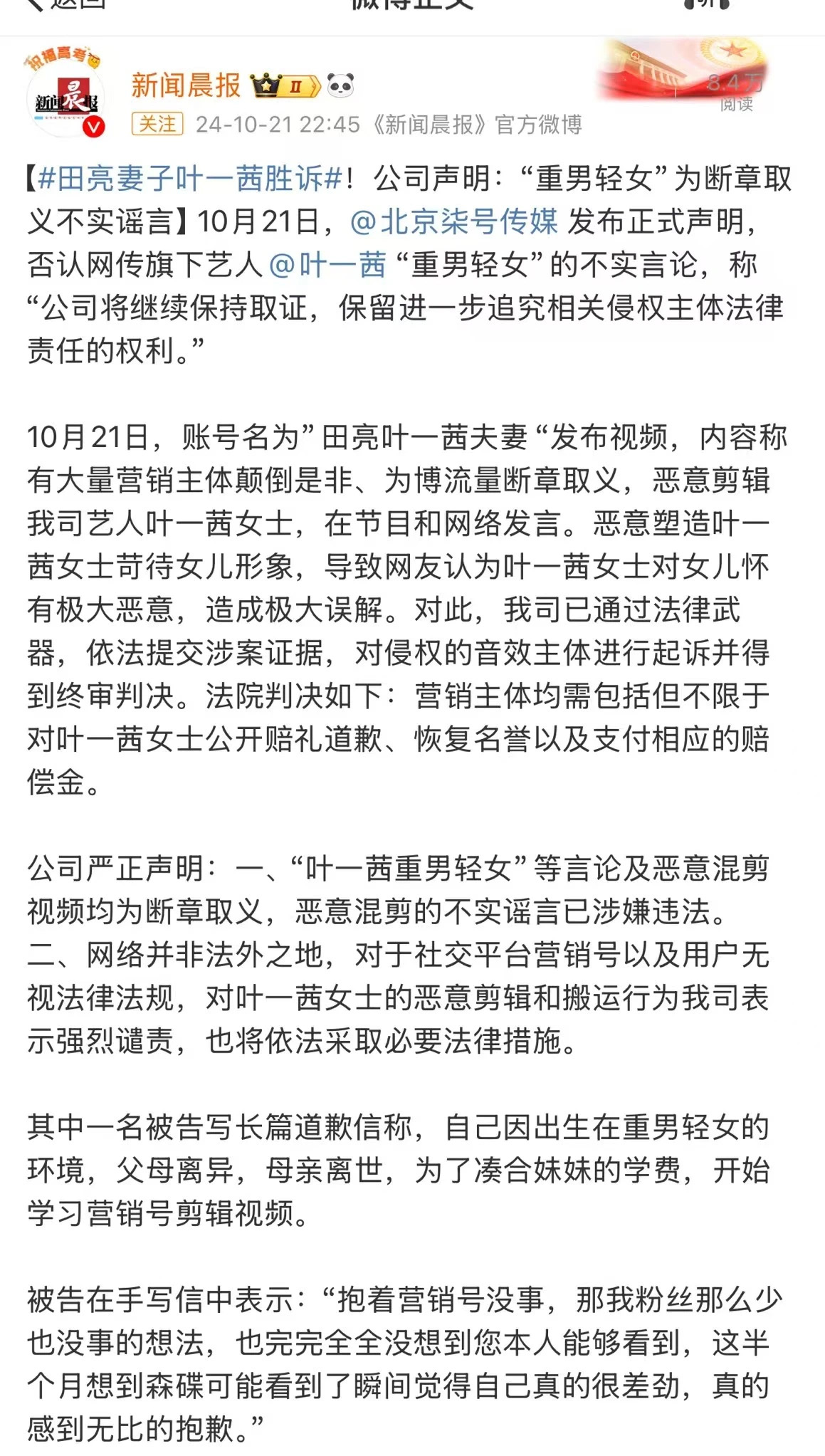 2024年10月,叶一茜公司发布声明否认重男轻女了,并且晒出了判决书和被告手写道歉信。