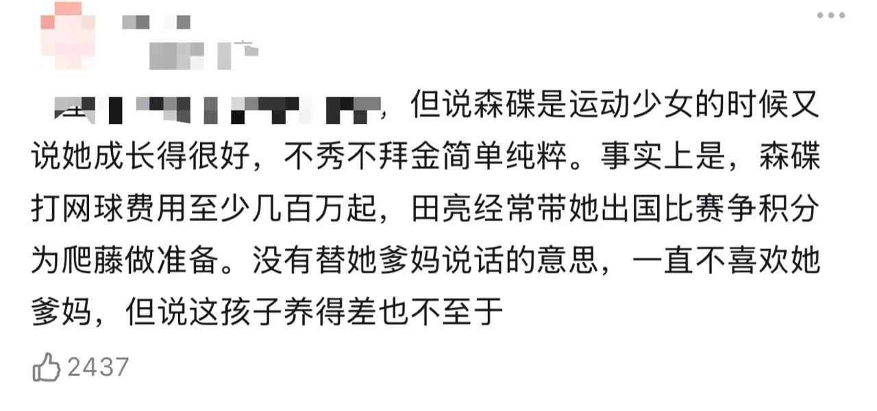 网上铺天盖地关于田亮叶一茜有没有把森碟养好的声音中,有网友指出有些说法太极端,他们一直培养森碟学各方面全面发展,支持孩子的兴趣打网球,很健康积极。