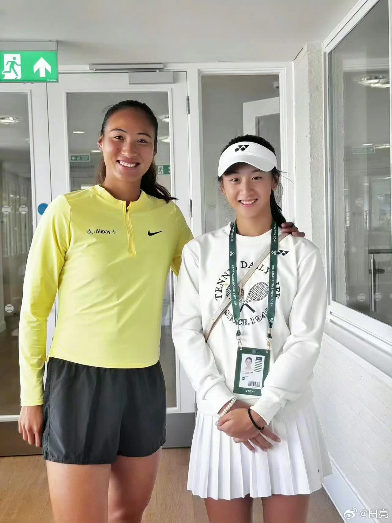 去年7月,田亮和孩子去看温网,带着森碟追星郑钦文。