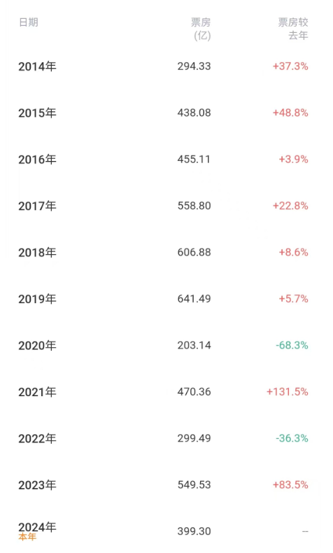 换言之,2024年年度总票房要追平去年549亿,最后一个月得整出150亿。哪怕追平2021年470亿,也得多赚70亿。这基本是不可能的任务。谁能想到,2024年的电影市场会回到2015年的水平。