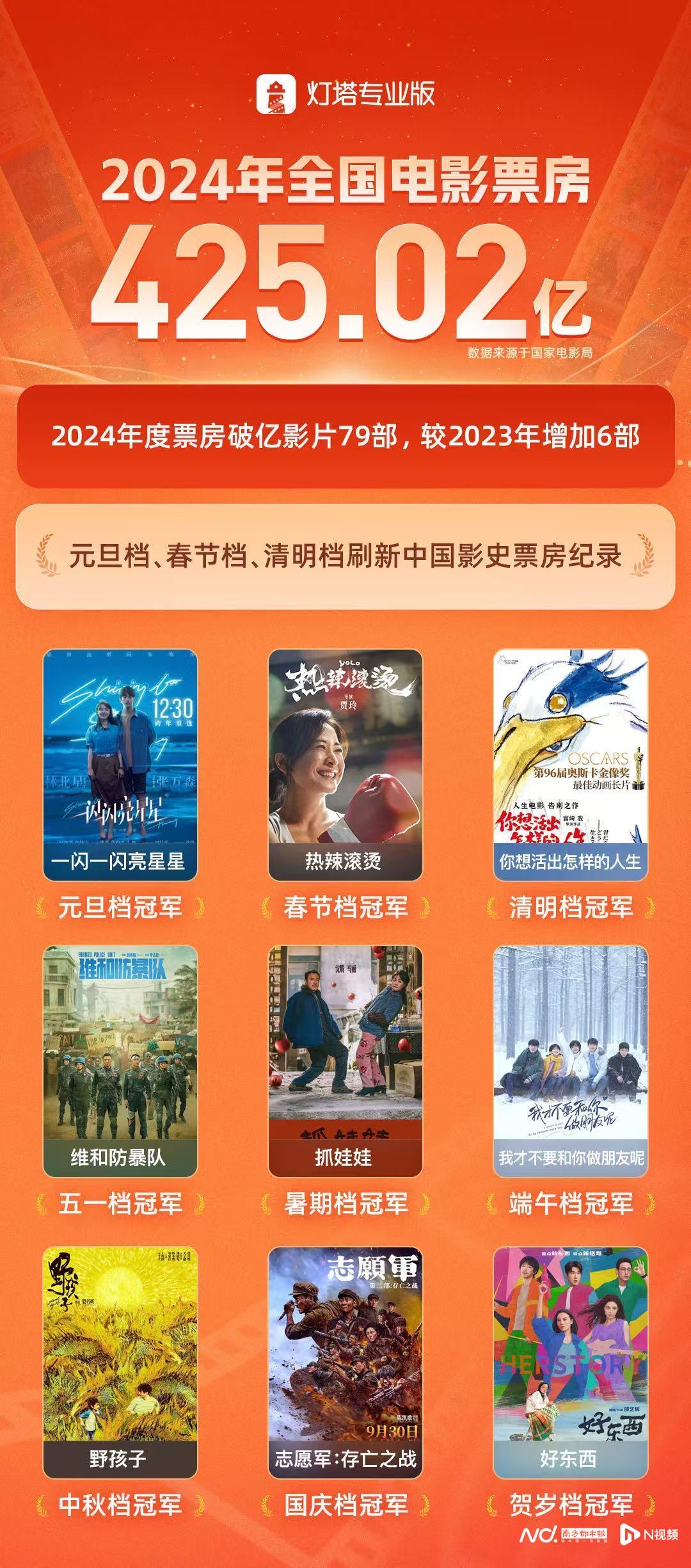 1月1日,国家电影局发布数据,我国2024年电影总票房达425.02亿元,观影总人次为10.1亿。其中,国产影片票房为334.39亿元,占比为78.68%。